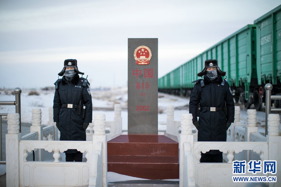 12月28日,二連出入境邊防檢查站民警在中蒙邊境815號界碑前執(zhí)勤,民警呼出的霧氣凝結(jié)成冰霜掛在帽子和防寒面罩上。新華網(wǎng)發(fā)(郭鵬杰 攝) -