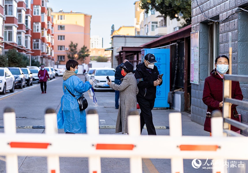 呼和浩特市玉泉區(qū)一處住宅小區(qū),社區(qū)網(wǎng)格員在查驗準備去核酸檢測點居民的健康碼。丁根厚攝 -